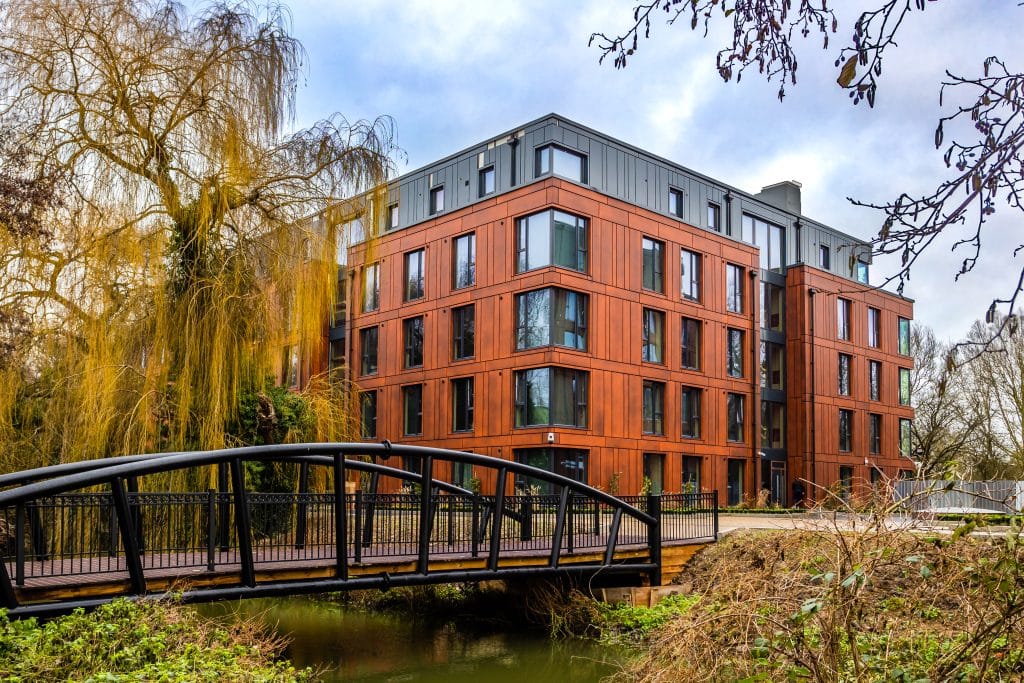 To the north of the site, the main constraints were the existing willow trees lining the river Chelmer and the flood zone. Block A is situated within the flood zone and sits on stilts to mitigate any potential impact of flooding. New bridges will link the site with Anglia Ruskin and the wider green spaces flowing through Chelmsford.